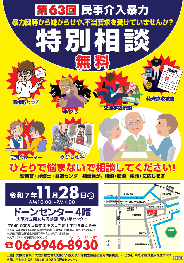 暴力団の壊滅をめざして施行された暴力団対策法のもと、府民の願いである「暴力のない安全で住み良い大阪」の実現を目指すため、様々なサービスを提供しております。